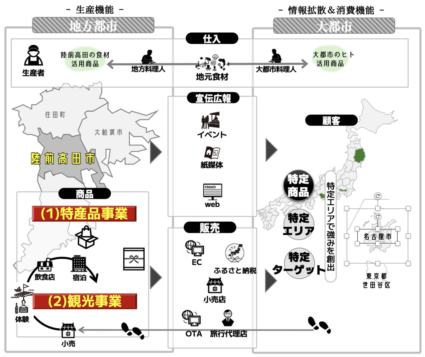 高品質の商品サービスを有しがらも認知と消費が課題の地方都市と、多くの人口を有し発信力と消費力を過かけながらも近隣に競合都市を抱え、差別化が必要な大都市 をつなぐ役割。