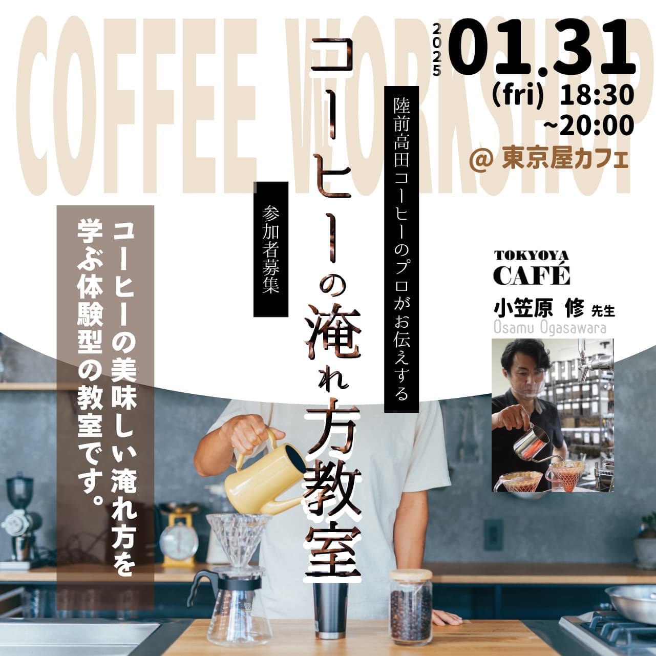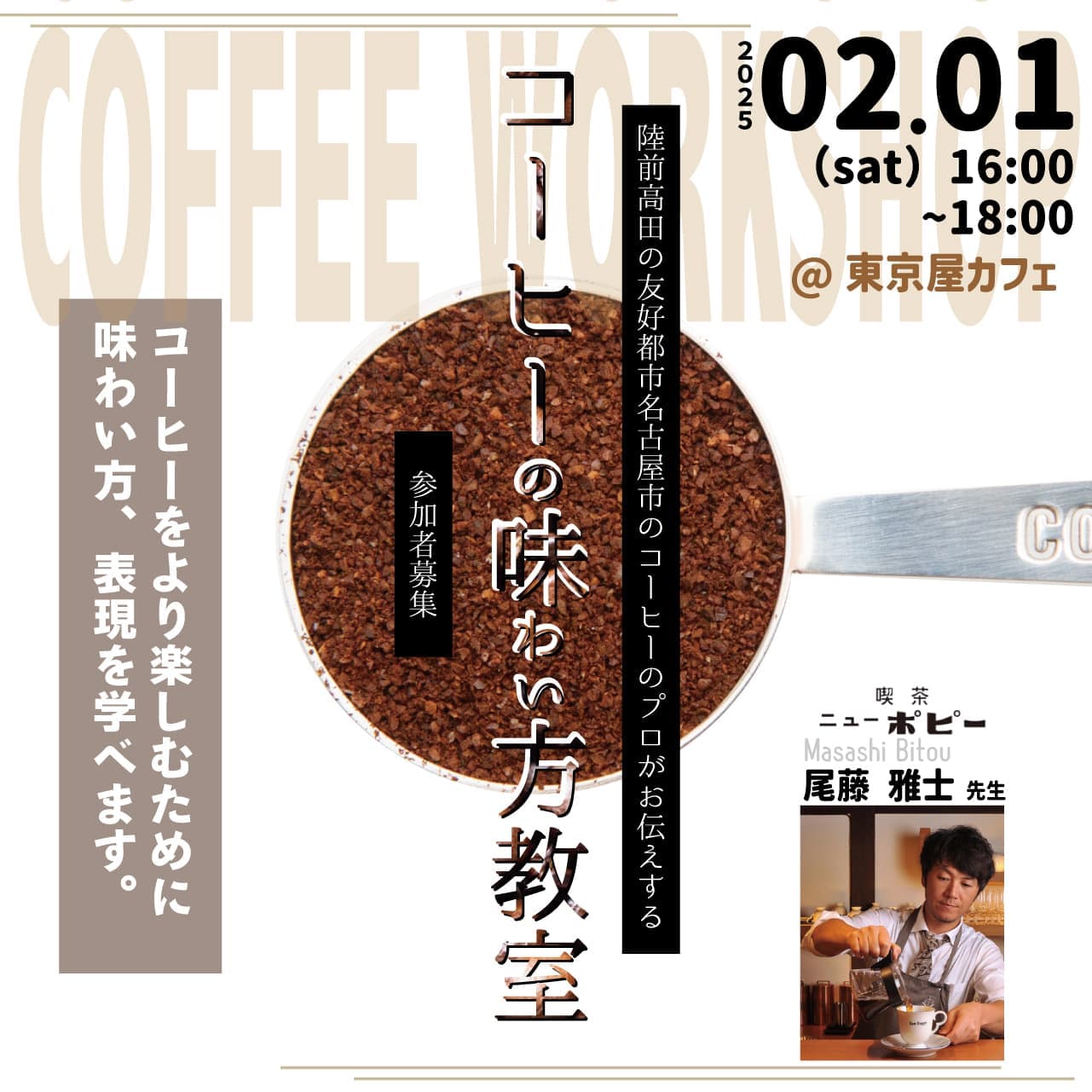 2/1(土)に、陸前高田の友好都市である名古屋市の老舗珈琲店のニューポピーの尾藤さんをお招きして、コーヒー生活をより楽しくするコーヒーの味わい方を体験する教室です。